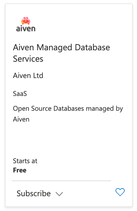 Search for “Aiven Managed Database Services” on the Azure Marketplace. This page contains information about all of Aiven’s services and how the marketplace subscription works. Click the Subscribe button on this page.